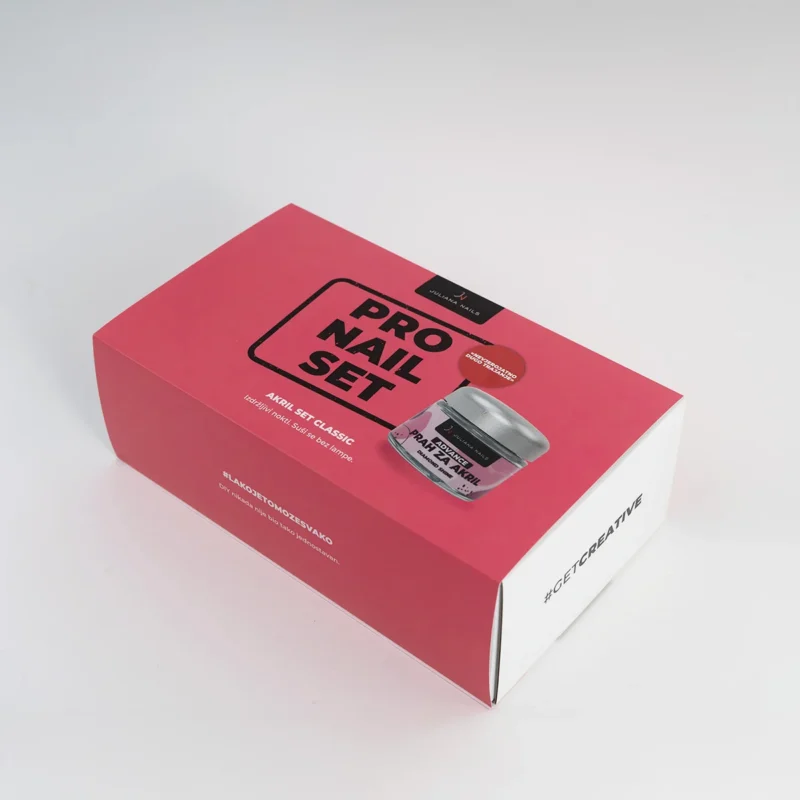 S tem setom dobite popolno salon izkušnjo kar doma. Vsebuje vse izdelke, ki jih potrebujete za izdelavo profesionalnih akrilnih nohtov (s podaljški ali brez) kar doma. Različni izdelki za pripravo nohtov, podaljški za nohte, akril in čopiči.