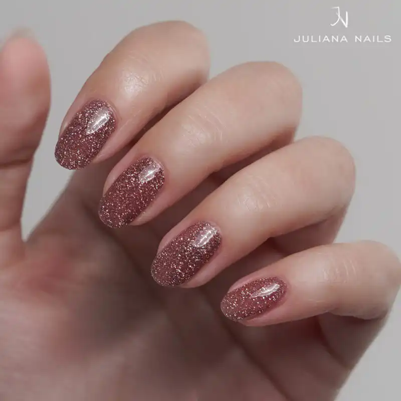 Naš Gel Lak Reflective Glitter Candle Drip je v sofisticiranem rožnato-rjavem odtenku. Bleščeči delci se lesketajo zlasti intenzivno v srebrni in rjavi niansi na sončni in umetni svetlobi.