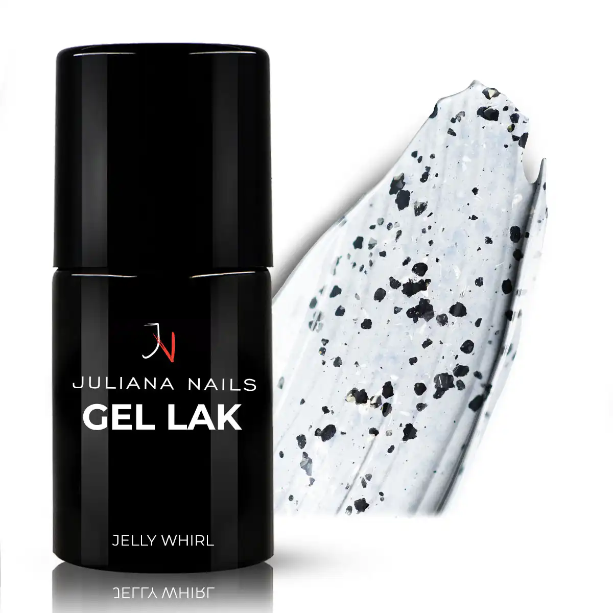 Naš Gel Lak Jelly Whirl je prozoren lak z drobnimi bleščicami, kosmiči in nitmi v zlati in črni barvi.