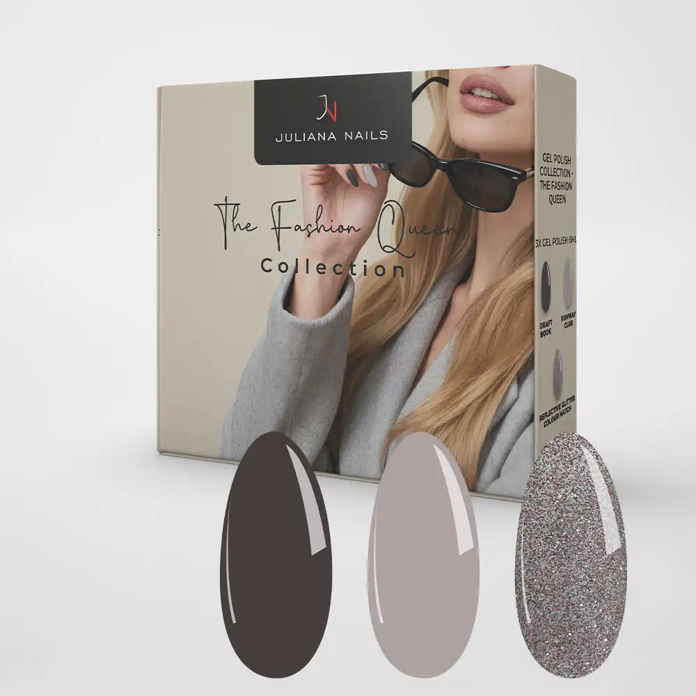 Naša kolekcija Gel lakov – The Fashion Queen je nepogrešljiv izbor za vse, ki obožujejo stil ter želijo biti kul in elegantni. Navdihnjena z modnimi pistami združuje tri zimske odtenke, ki se popolno dopolnjujejo: Runway Club, moderen, nežen bež-siv odtenek; Draft Book, temen in hladen rjavo-siv odtenek; ter Reflective Glitter Colour Match, bleščečo, luksuzno mešanico bleščic.