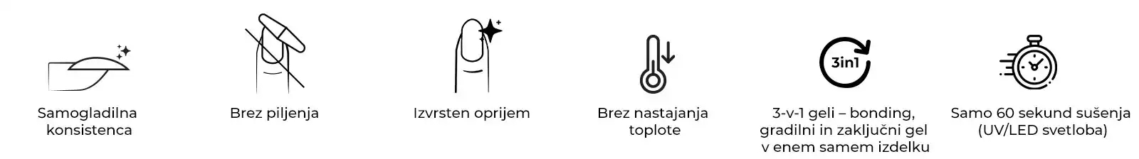 Ta UV gel salosnke kakovosti nudi odličen oprijem in se suši brez segrevanja. Idealen je za profesionalce in vse mojstre nohtov, ki imajo radi samonivelirne gele, želijo prihraniti dragoceni čas in se izogniti nadležnemu prahu pri piljenju.