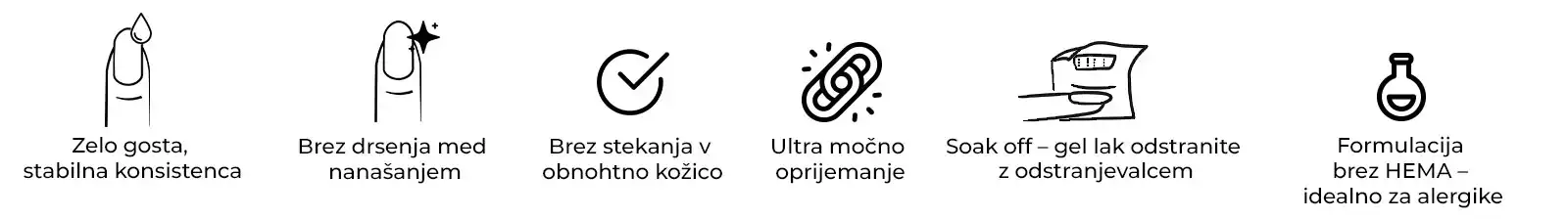 Sestavino HEMA smo namerno izločili in jo nadomestili z drugimi alternativami. To pomeni, da lahko tudi osebe z alergijami uživajo v čudoviti negi in oblikovanju nohtov v rekordnem času.
