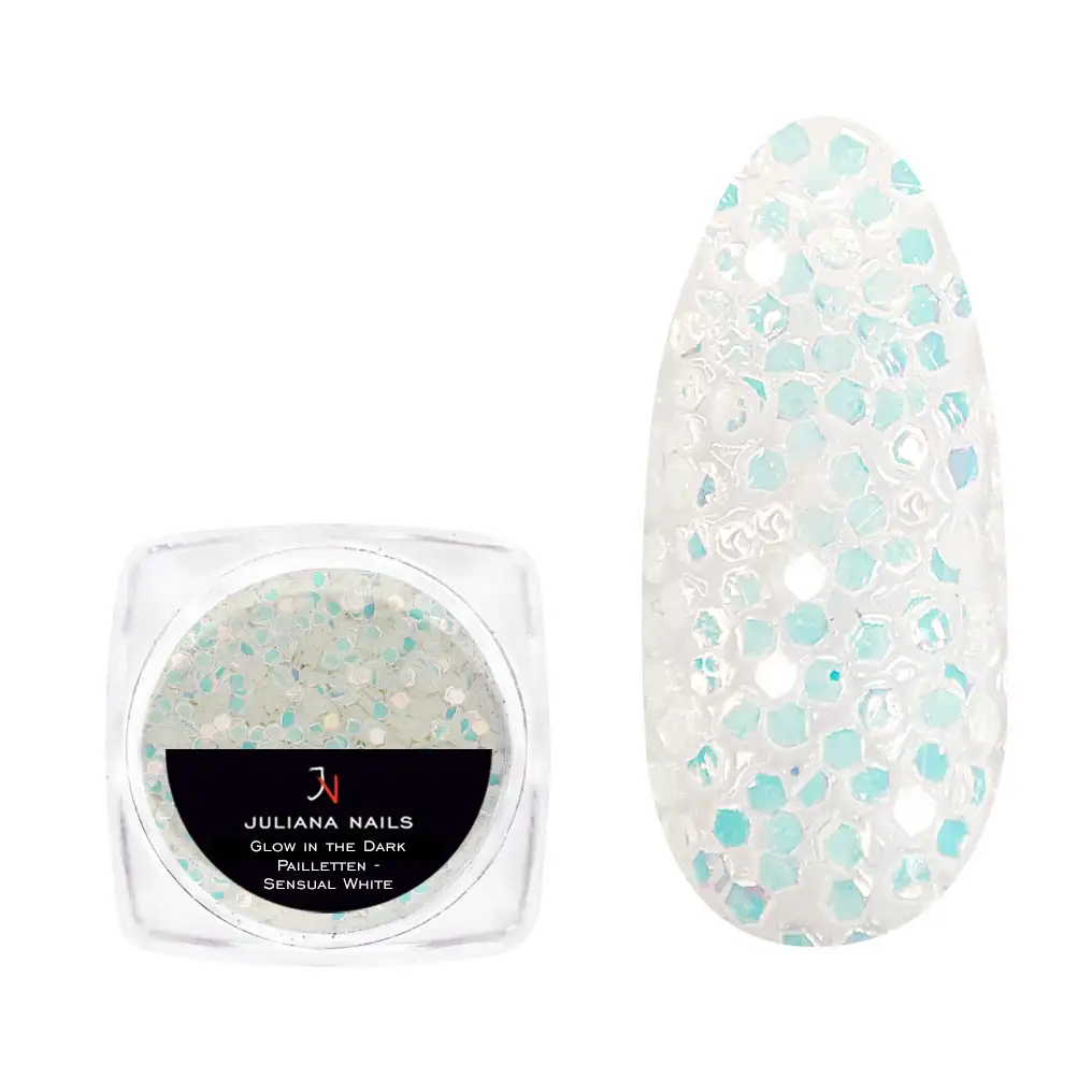 Glow in the Dark šljokice – Sensual White su bijele šljokice koje svijetle plavkasto u mraku.