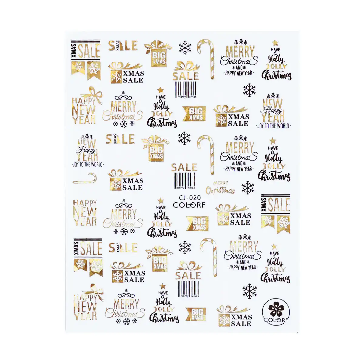 Nalepke za nohte – X-Mas Mood 9 vsebujejo trendovske božične dizajne v črni in kovinsko zlati barvi. V kompletu prejmete različna besedila in lizike.