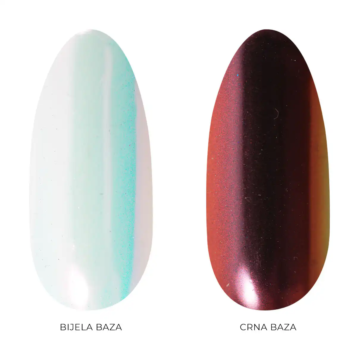 Trendovski Glazed Aurora videz združuje dva najlepša trenda nail arta: bleščeč učinek Aurora in reflektirajoč zrcalni zaključek. S tem pigmentom lahko svoje nohte spremenite v pravo pašo za oči – sijoče, glamurozne in popolnoma edinstvene.