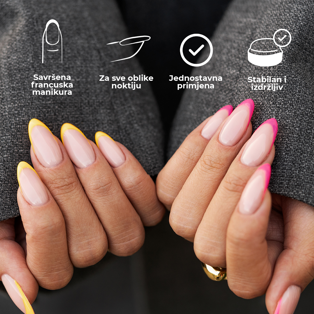 Izjemno velika površina se odlično prilagaja obliki nohta, zagotavlja enostavno uporabo in izjemno stabilnost. Zlahka lahko dosežete eleganten in profesionalen rezultat.