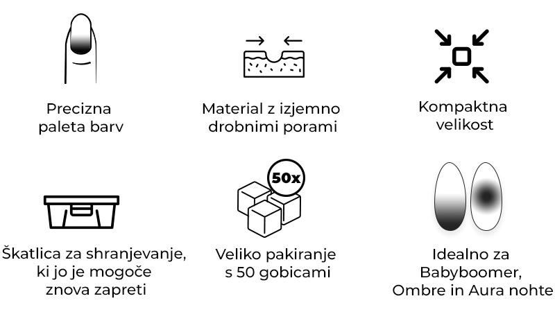 Zahvaljujoč svoji majhni velikosti Mini Ombre gobice omogočajo delo z izjemno natančnostjo, brez nenamernega dotikanja obnohtne kožice. Popolne so za ustvarjanje mehkih barvnih prelivov točno tam, kjer jih želite. Odlično se prilegajo praktičnemu Ombre pripomočku, zato jih ni treba držati s prsti.