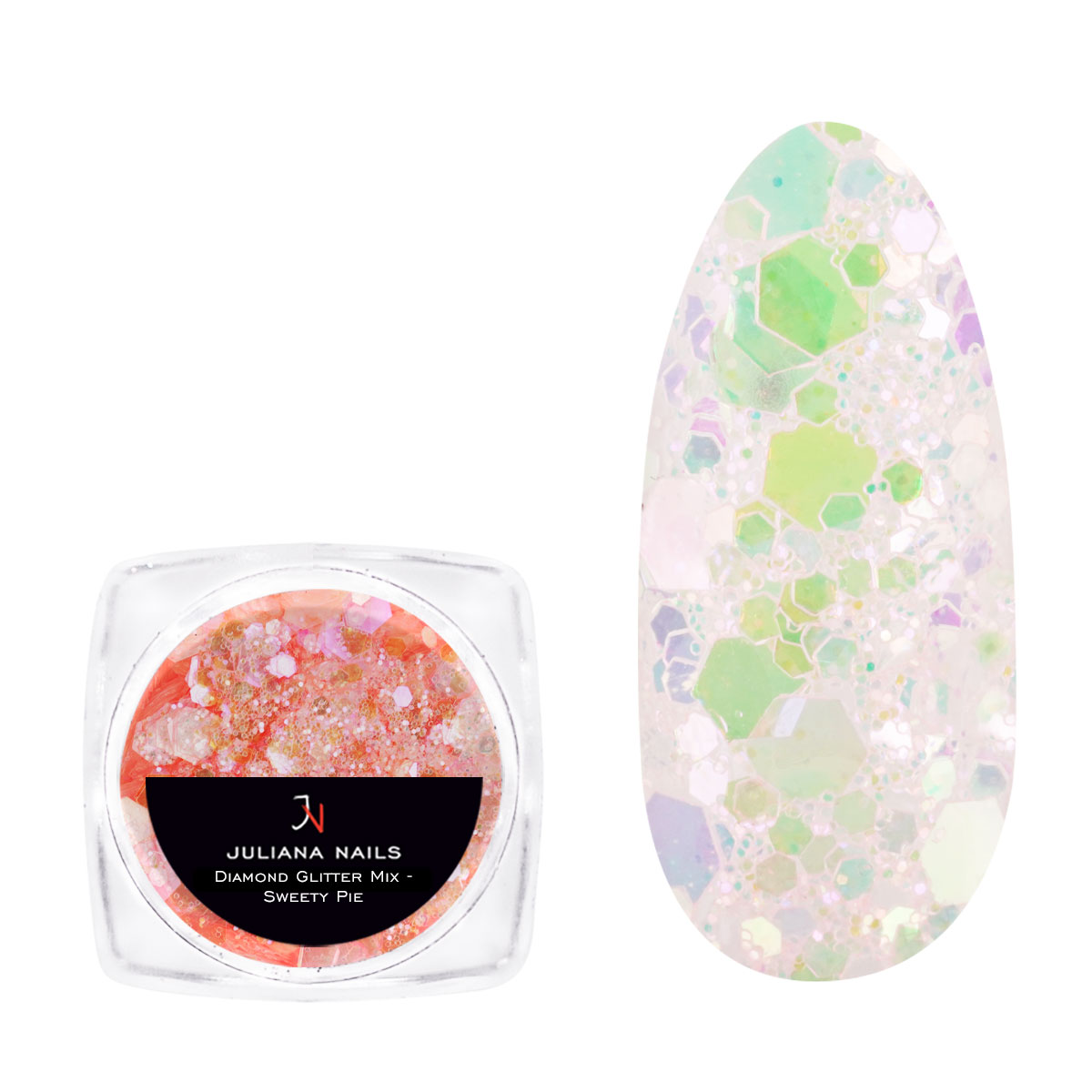 Kombinirajte Juliana Nails Diamond Glitter Mix sa svojom omiljenom bojom. Napravite male naglaske na noktima ili prekrijte cijeli nokat. Nokte možete zaštititi [završnim slojem] ili stvoriti trendi šećerni izgled – sve je moguće!