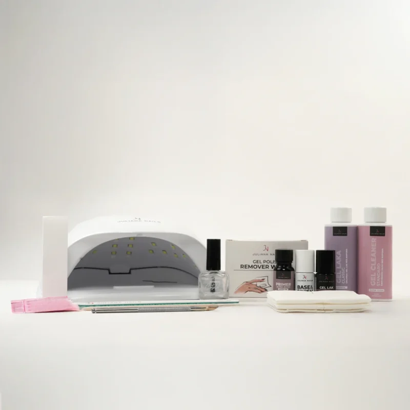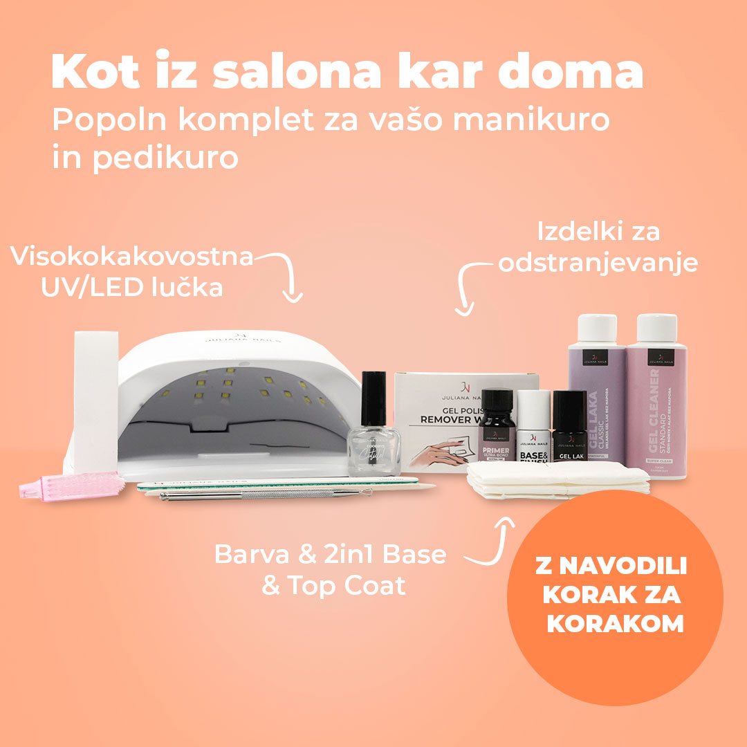 S tem kompletom dobite popolno salon izkušnjo za nohte kar doma. Vsebuje vse izdelke, ki jih potrebujete za profesionalno manikuro in pedikuro z gel lakom doma. Različni izdelki za pripravo nohtov, baze, zaključni sloji, barva, UV/LED lučka in izdelki za odstranjevanje. Poleg tega prejmete zelo enostavna navodila korak za korakom ter profesionalni video. Torej, zagotovljeno deluje – tudi za začetnike!