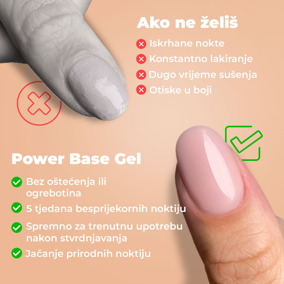 Prilagodite bazo gel laka svojim naravnim nohtom: Ni vsak izdelek primeren za vsak naravni noht! Če imate zelo mehke, prožne ali poškodovane nohte, priporočamo naš ekstra močan Power Base. Za nohte z občutkom slabšega oprijema pa je Rubber Base Gel prava izbira.