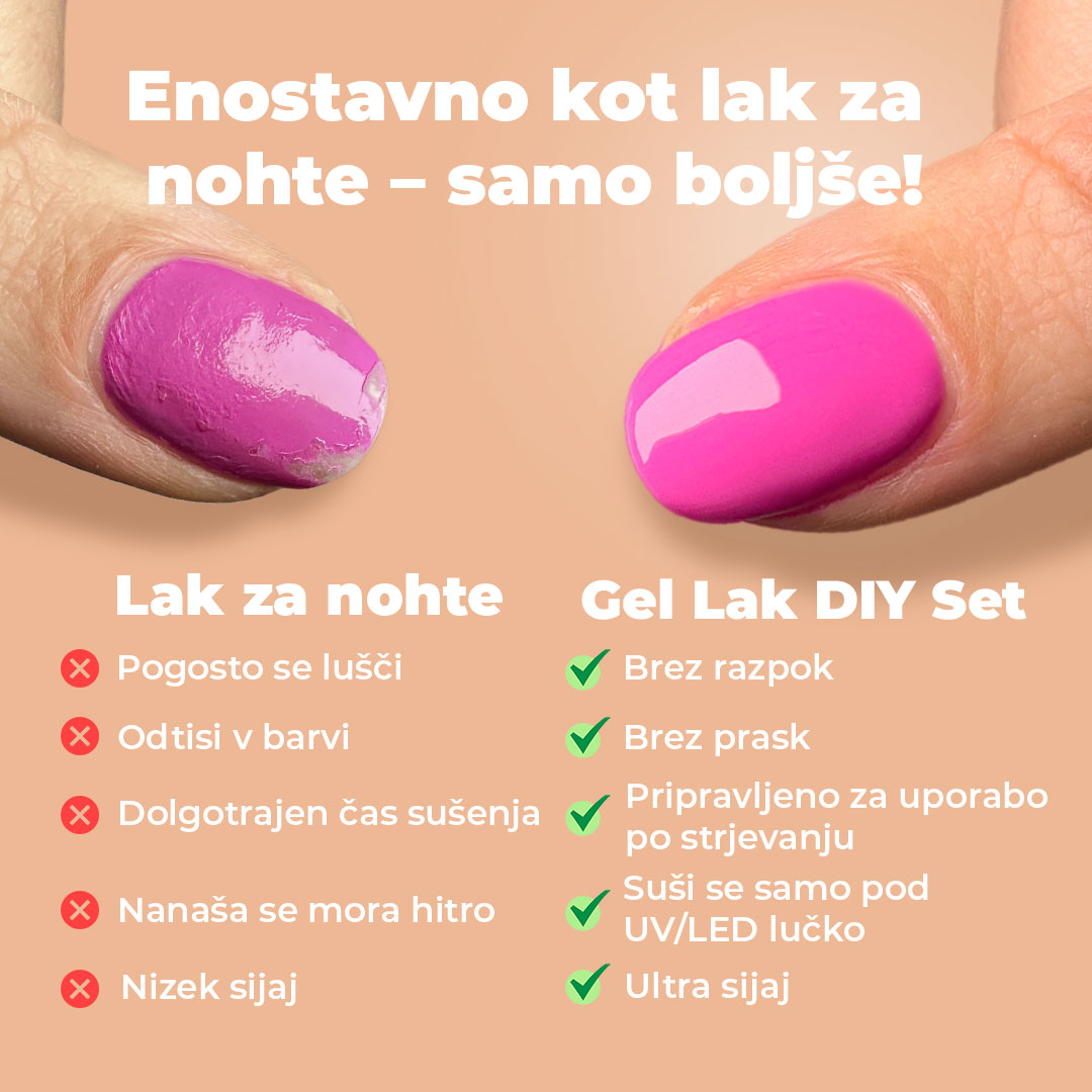 Gel lak se od navadnega laka za nohte razlikuje po svoji inovativni sestavi in daljši obstojnosti. Medtem ko se navaden lak suši na zraku in na nohtu zdrži le nekaj dni, se gel lak suši pod UV ali LED svetlobo ter nudi impresivno obstojnost do 5 tednov brez prask ali luščenja.